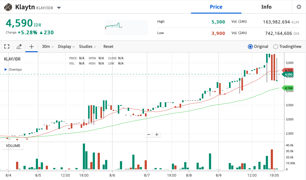 아래는 업비트 인도네시아에 상장되어 있는 클레이의 현재 거래가격입니다. 약 4,590 IDR에 거래되고 있는데, 현재 환율로 보면 약 370원입니다. 암호화폐가 거래소별로 차이가 좀 있나봅니다. 이렇게 인도네시아와 싱가포르에는 있지만 아직 원화마켓엔 지닥에서만 거래가 가능한 상태인데요.