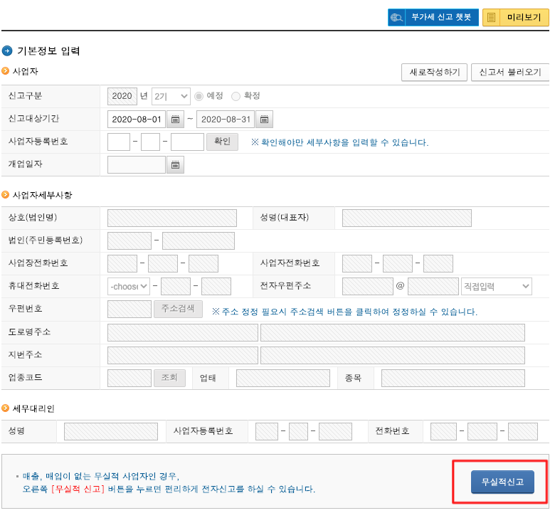 * 실적이 없는 경우는 홈택스에서 부가세신고시 기본정보 입력아래 부분에 있는 무실적 신고를 이용해서 간편하게(?) 신고할 수 있습니다.