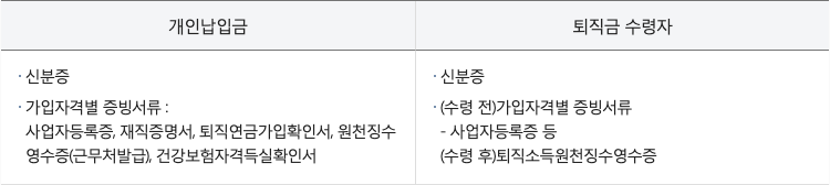 | 기존 | 퇴직근로자 | 퇴직연금제도(DB, DC)에서 퇴직급여를 수령한 근로자(의무) 퇴직급여 일시금 또는 중간정산금 수령자(자율) |