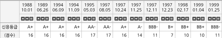 S&P는 현재 우리나라 신용등급을 투자적격등급 중 신용상태 우수등급인 AA를 2016년 부터 유지하고 있는데요. 1997년엔 무려 4번이나 하향조정을 했었고, 1999년에도 3차례나 조정했습니다. 다만 1997년은 하락, 1999년은 상승했네요.