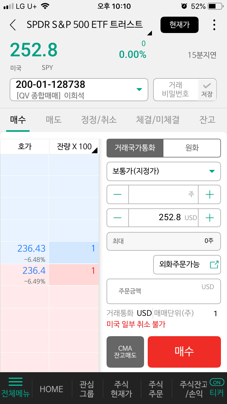 이리저리 해보는 동안 장이 열렸는지 색깔도 바꼈네요. SPY를 선택하면 일반적인 주식 구매하는 것처럼 화면이 나옵니다.