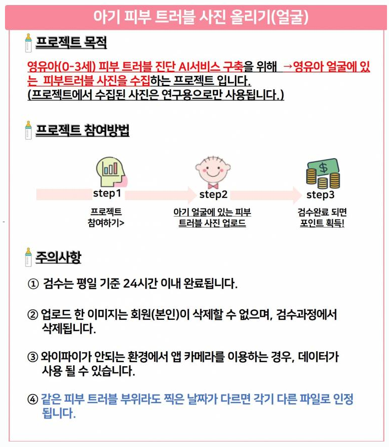 프로젝트는 일정한 기간을 두고 새로운 것이 올라오고 있구요. 현재 홈페이지에 올라와 있는 프로젝트들을 살펴보면, 아기 피부트러블 얼굴 사진 올리기, 문서요약 프로젝트, 오늘의 코디룩 올리기 같은 사진이나 텍스트를 올리고 수정해줌으로서 건별로 비용을 정산 받을 수 있는 것도 있고, 지수어 영상 올리기 처럼 봉사시간을 받을 수 있는 프로젝트도 보입니다.