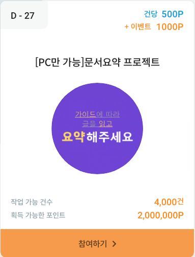 건당 포인트로 제공을 받는 것 같은데요. 포인트가 200P인트와 같이 소소하지만 작업 가능한 건수가 많은 경우도 있고, 마감된 것 하나를 살펴보니 건당 비용이 좀 높지만 건수가 적은 프로젝트도 있습니다.