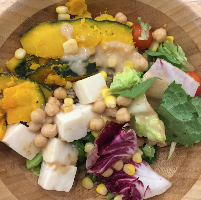 단호박 두부 웜볼은 7800원인데요. 안에 곡물밥이 깔려 있다고 생각하시면 됩니다. 밥량은 최소한 한공기는 되어 보이구요. 그 위에 단호박과 두부가 토핑되어 있습니다. 밥이 따뜻한 밥이고 잡곡밥입니다. 옥수수 알갱이들이 들어 있어요. 거기에 병아리콩도 토핑되어 있구요. 그리고 채소 약간과 방울토마토가 있습니다. 오리엔탈 드레싱이 기본 소스로 나옵니다. 밥의 양이 많아서 그런지 약간 싱겁게 느껴질 수 있는데 소스를 요청하면 더 줄 것 같았습니다. 근데 저는 그냥 먹었어요. 어차피 염분을 좀 줄이는 게 목적이기도 해서요.