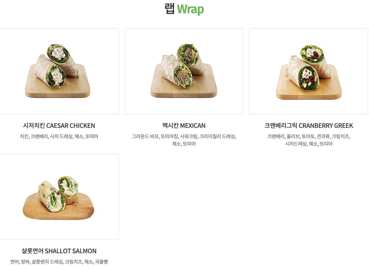 웜볼, 샐러디, 샌드, 랩 메뉴
