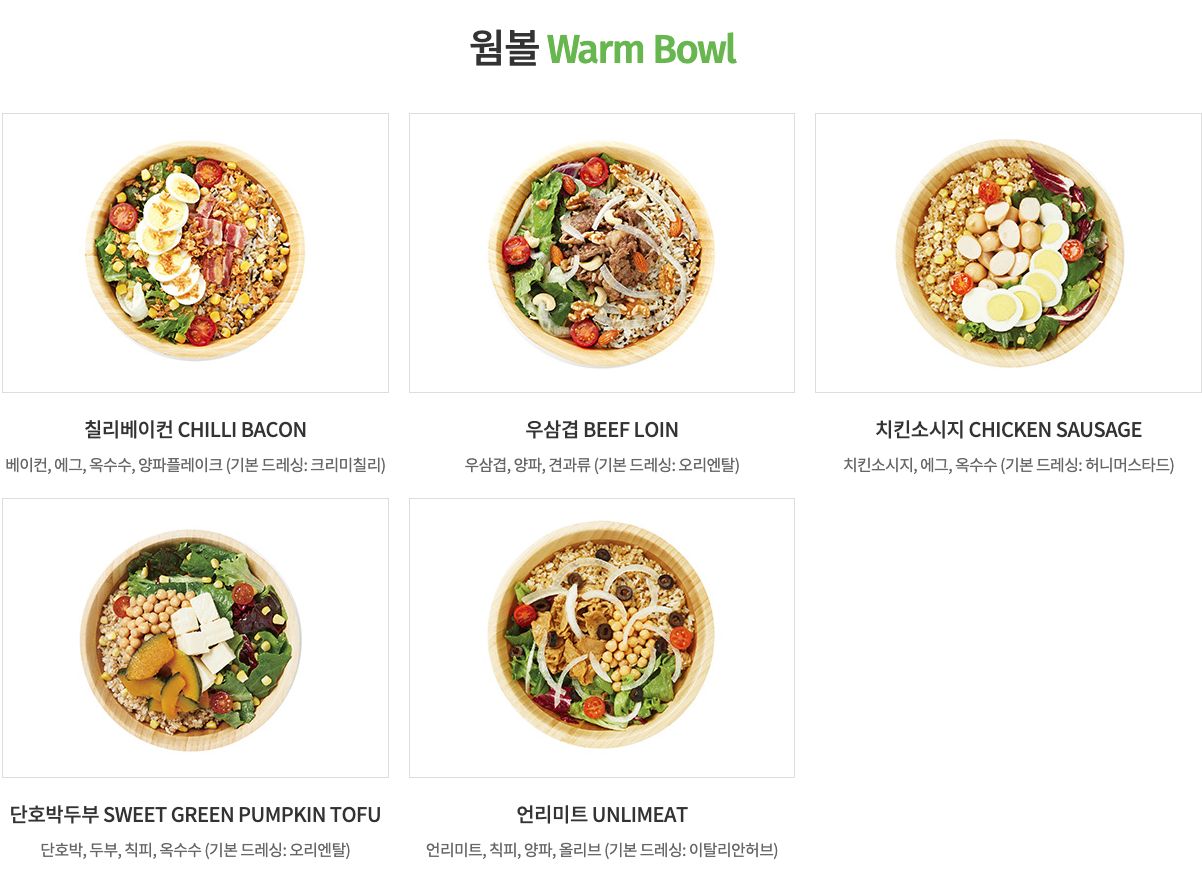 계절 한정 메뉴들도 있던데 제외하구요. 따뜻한 곡물밥이 베이스로 되어 있는 웜볼, 신선한 샐러드류인 샐러디, 햄버거 처럼 생긴 샌드, 또띠아 랩으로 샐러드를 간편하게 먹을 수 있는 랩(&웜랩)이 기본 메뉴이고 사이드로 스프와 몇가지 음료메뉴가 있습니다.