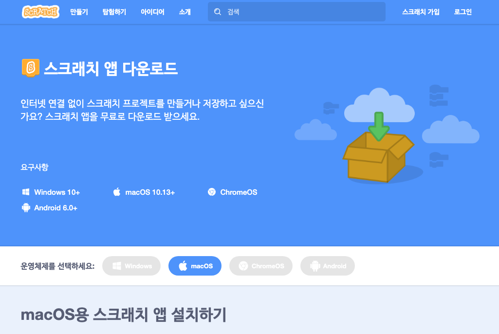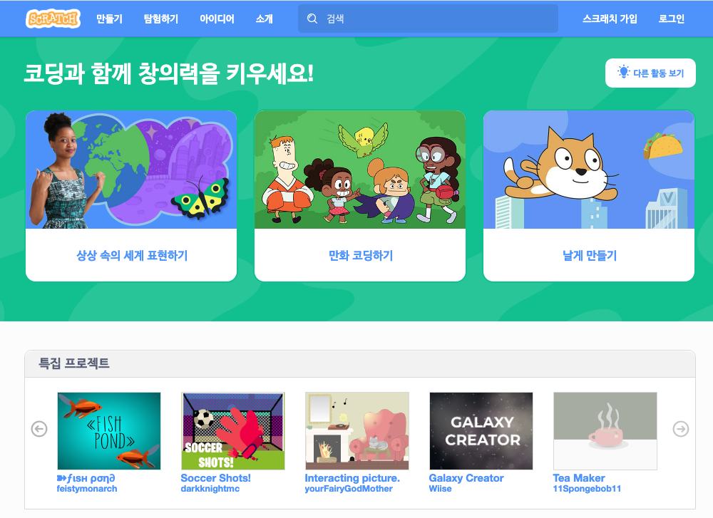 스크래치는 홈페이지에서 브라우저로 바로 사용할 수도 있고, 데스크탑 앱을 내려받아 사용할 수도 있습니다.