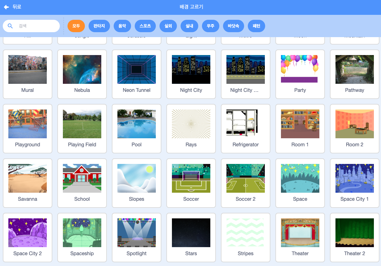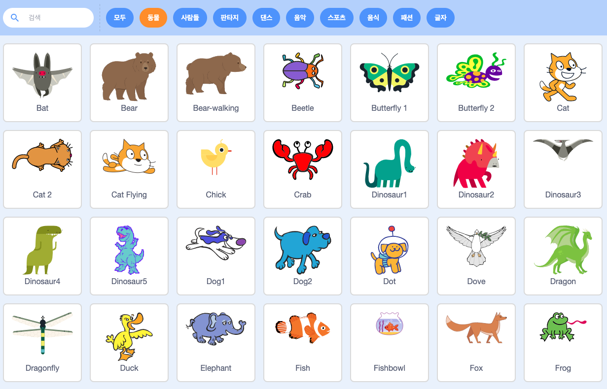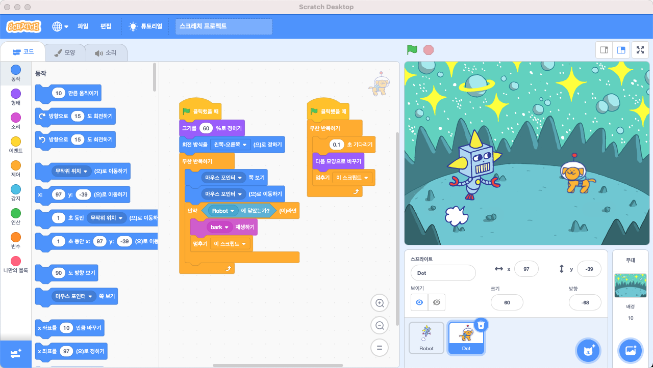 화면에서 움직여야하는 요소들은 스프라이트라고 부르고 배경이 되는 요소는 무대라는 것으로 선택해서 가져올 수 있습니다. 자신이 만든 이미지도 넣어서 자기만의 것을 만들 수도 있겠죠. 위 화면에서 고양이 얼굴 모양을 누르면 스프라이트를 추가할 수 있고 그 오른쪽에 있는 배경그림 모양 아이콘을 누르면 배경 이미지를 선택할 수 있습니다. 저는 스프라이트는 강아지와 로봇을 선택했고 배경은 Space를 선택했습니다.