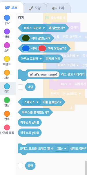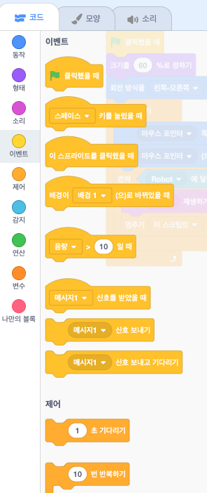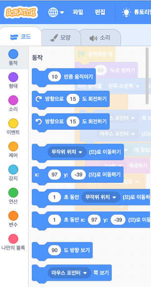 코딩요소는 왼쪽의 코드라는 탭을 누르면 동작, 형태, 소리, 이벤트, 제어 등등 다양한 요소들이 미리 만들어져 있어서 가운데 화면부분에 끌어다 놓으면 됩니다.
