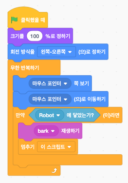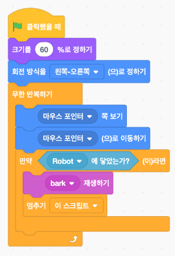 마지막으로 무한 반복이 어떤 경우에 종료되는지를 넣어주는데, 로봇에 닿으면 무한 반복하던 동작을 멈추게 되고, bark 소리가 재생되도록 해줬습니다.