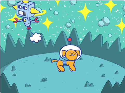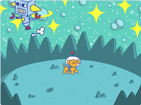 저는 강아지가 우주에서 집사 로봇을 피해 도망다니는 컨셉으로 게임을 만들었어요. 마우스로 강아지를 드래그하면서 쫓아다니는 로봇을 피해야 합니다.