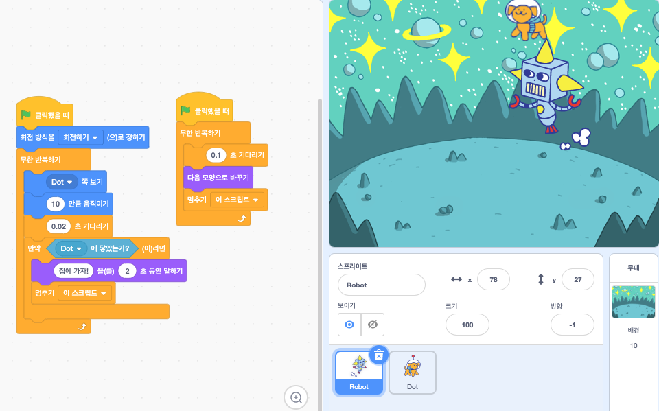 옮겨 놓은 다음 몇가지 달라야 하는 부분만 수정을 해주면 간단히 코딩을 마무리할 수 있는데요. 로봇은 아까 말씀드린 대로 회전 방식은 "회전"으로 합니다. 그리고 마우스포인터를 강아지가 즉시 따라 가는 것이라면 로봇은 바로 따라오면 강아지가 도망갈 수가 없으니 약간의 인터벌을 주도록 합니다(0.02초 기다리기). 강아지는 마우스포인터를 따라가고 로봇은 Dot라는 강아지 스프라이트를 따라가는 것이라 바라보는 방향도 Dot로 바꿔줍니다. 움직임은 10만큼씩만 움직이게 했습니다. 그다음 Dot에 닿으면 집에가자라는 말풍선이 나오도록 해줍니다.