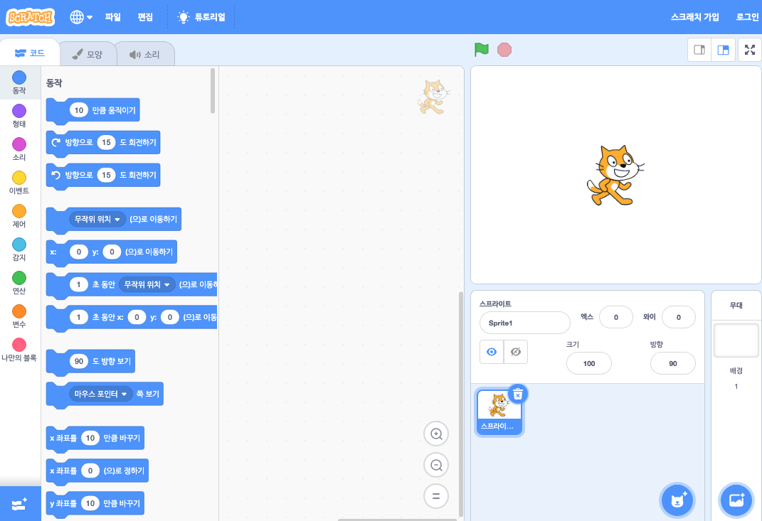 아래 스크래치 홈페이지에서 만들기 메뉴를 누르면 바로 코딩을 할 수 있는 화면으로 이동하게 됩니다.