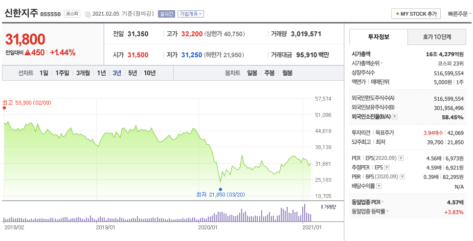 회사가 자기 주식을 사들이면 시장에 유통되고 있는 주식수가 그만큼 줄어듭니다. 회사가 보유하게 된 주식은 의결권이나 배당에서도 제외되니까 각 주당 순이익이 올라가게 되므로 자사주 매입은 주가를 상승시키는 요인이 됩니다. 그래서 회사에서 자사주를 매입한다는 소식이 들리면 주주들이 반기는 것이죠. 작년말 미국 연준이 대형은행들의 자사주 매입을 허용한다는 소식이 있었습니다. 2020년 코로나로 인해 전세계의 대형은행들은 자사주매입과 배당금 지급이 금지됐었거든요. 그래서 주가도 다른 종목들이 오를 때 크게 오르지 못했다고 합니다. 그래서일까요? 신한지주의 주가는 최근 몇년 중 작년이 가장 낮은 해였네요. 경기가 좋지 않은 이유도 있었겠지만 혹시 자사주매입과 같은 이슈로 전세계 은행들과 키맞춤을 하고 있던 것은 아닐까요?^^