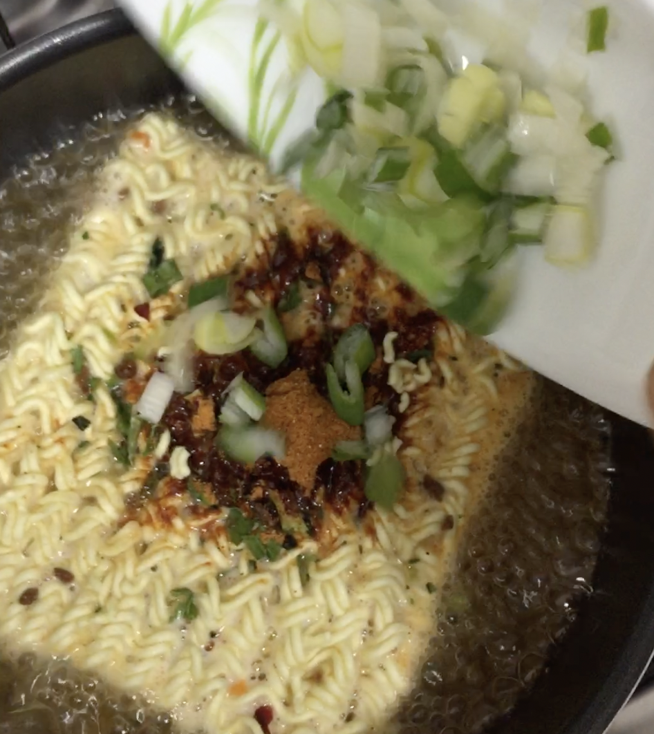 파를 넣고 40초간 더 끓여봅니다. 면을 풀어주고 스프도 섞이게 하고 ... 물이 끓고 30초 정도 지났을 때 라면의 상태는 과연 어땠을까요?
