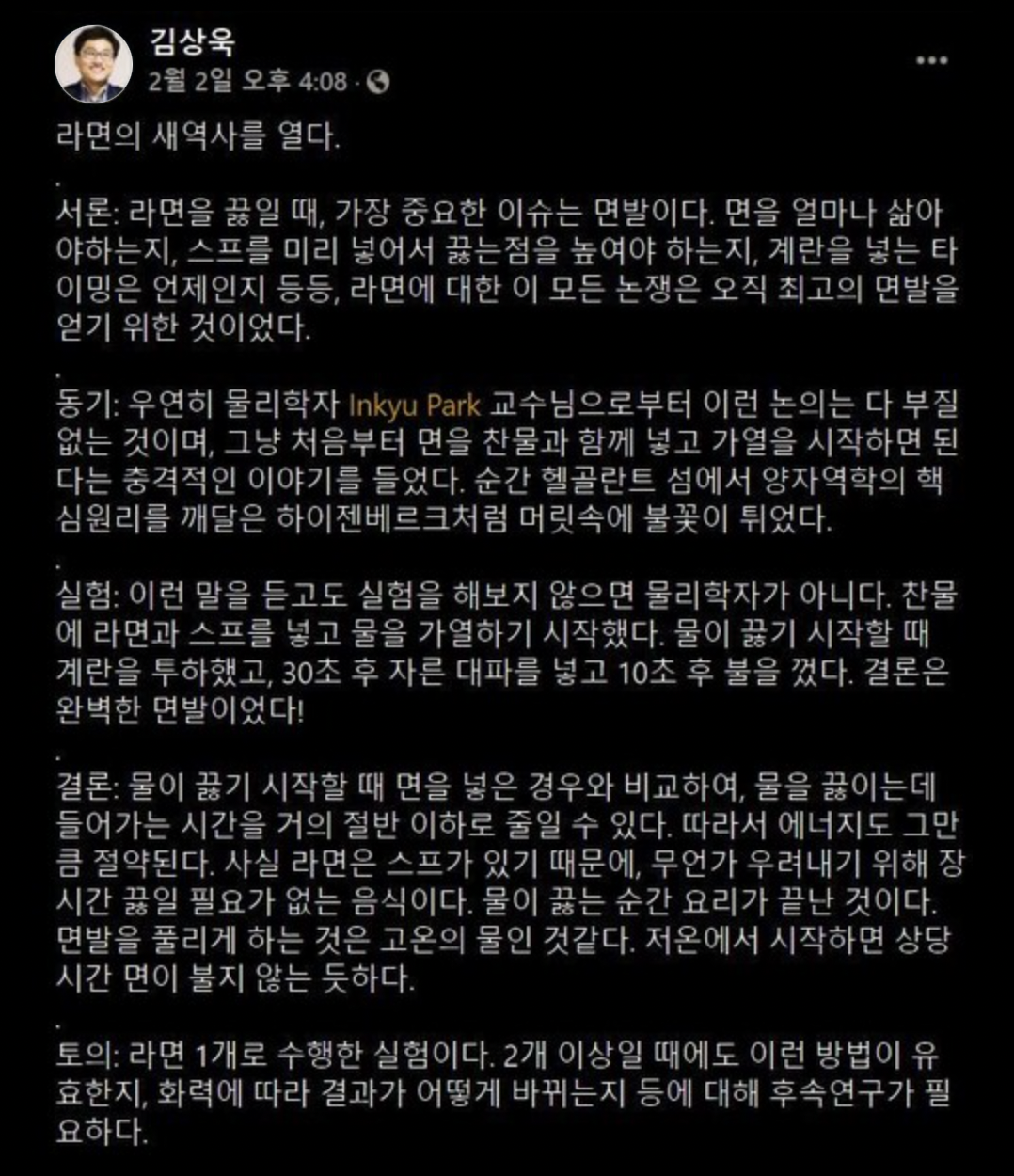 라면끓일 때 최고의 맛과 최상의 면발을 얻기 위한 노력이 수없이 존재하고 시도가 끊이지 않죠. 대단한 요리가 탄생하는 레시피가 존재하는가하면 라면답게 더더욱 간편하게 끓이는 다양한 방법도 존재합니다. 사발면도 그렇게 나온게 아닌가 싶고, 군대에선 뽀글이를 탄생시키고요. 물의 양을 원래 레시피보다 늘려야한다 줄여야한다 등등 각각의 취향을 반영한 다양한 레시피가 흥망성쇄합니다. 저도 오늘 김상욱 교수님의 조리법대로 찬물에 바로 면을 투하해서 끓이는 방법으로 라면을 조리해봤습니다.