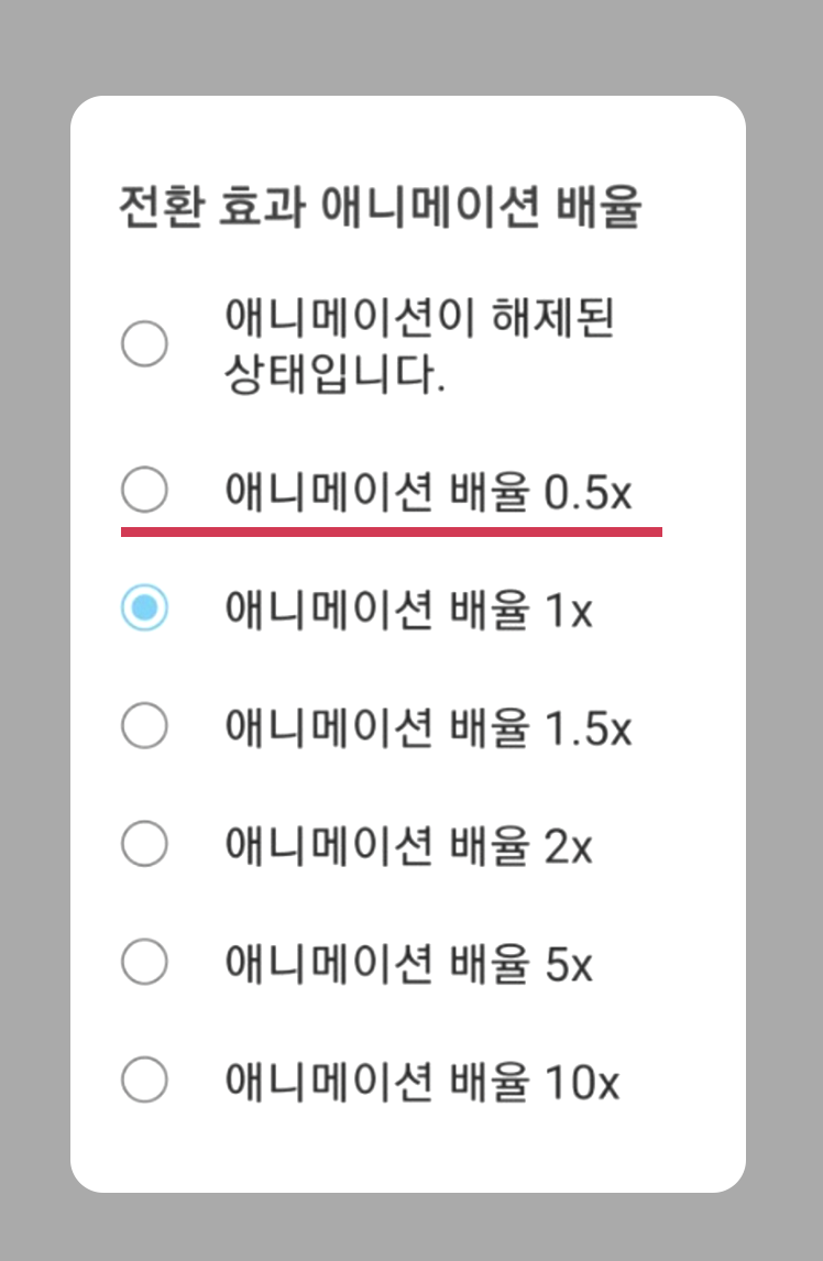 개발자 옵션을 보면 폰의 버전마다 조금씩 다를 수 있지만 화면 켜짐상태 유지, 야간모드사용(안드로이드 9.X 이상), 디버깅, 애니메이션 배율, 앱 등 다양한 설정을 할 수 있는데요. 이중에서 애니메이션 배율은 창 애니메이션 배율, 전환 효과 애니메이션 배율, Animator 길이 배율 등이 보입니다. 이들은 기본 1X(1배)로 되어 있는데요. 터치해보면 설정을 변경할 수 있습니다. 0.5X 로 변경해주세요. 3가지 모두 애니메이션 배율을 0.5 로 바꿔주는 겁니다. 이렇게 하면 원래 애니메이션을 하는데 1초가 걸리도록 되어 있었다면 0.5초로 시간을 단축하는 것이기 때문에 (실제로 리소스도 덜 사용할 거예요) 폰의 속도를 빠르게 할 수 있습니다. 대신 전환할 때 좀 덜 부드럽게 느껴질 수는 있어요.
