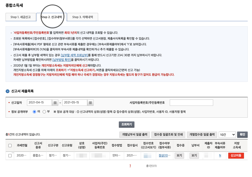 세금신고를 취소하는 다른 방법은 아직 신고기간 중이라면 다시 신고서를 작성하고 제출하면 업데이트가 된다고 합니다. 위에 스탭2에 보면 신고한 내용이 1건인데 제가 앞서 한번 신고했던 것은 사라지고 새로운 것으로 업데이트가 된 거예요. 그러니 신고 기간 중이라면 (종합소득세는 5월 31일까지) 삭제요청을 따로 할 필요 없이 다시 신고서를 작성, 제출하면 됩니다. 몇번이고 다시 할 수 있다고 하네요.