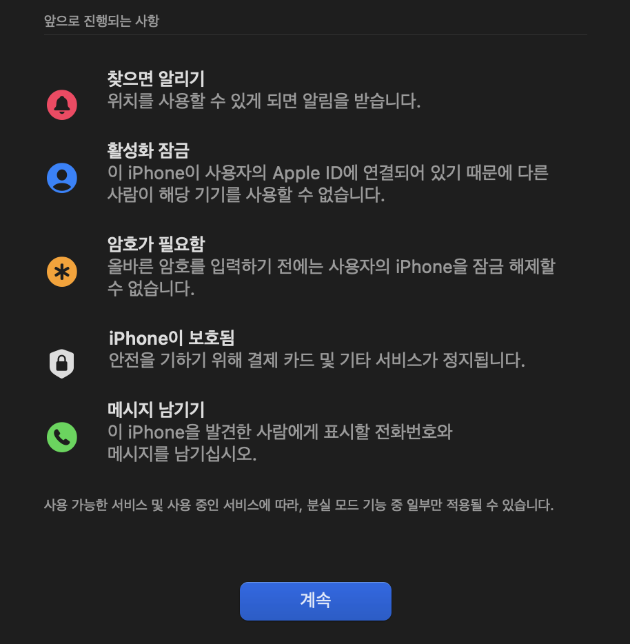 활성화라는 것을 누르면 이 기능이 앞으로 어떻게 작동하는지가 설명되어 있습니다. 찾으면 알리기, 활성화 잠금, 사용자의 암호를 입력해야만 열 수 있는 상태로 바뀝니다. 아이폰이 보호되고, 메시지 남기기. 이렇게 여러가지로 잠금과 함께 화면에 분실 폰 상태를 습득한 사람에게 인지시켜줄 수 있습니다.