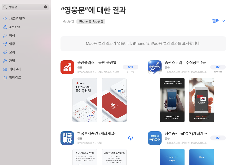 키움증권 계좌를 개설하고 영웅문도 사용해보려고 하는데요. 문제는 제가 맥을 이용하고 있기 문에 맥에서는 키움증권의 영웅문을 쓸 수 업사는 문제가 있습니다. 하나는 아이패드에서 이용할 수 있는 영웅문 T plus이고 다른 하나는 맥에서 영웅문 T plus를 사용해보려고 합니다. 결론 부터 말씀드리면 맥용 앱은 지원하지 않습니다. 제가 테스트해본 방법은 실리콘인 M1 맥북에서 아이폰 또는 아이패드 앱을 시도해보고자 한 것인데요. 다른 방법은 하나 더 있습니다.