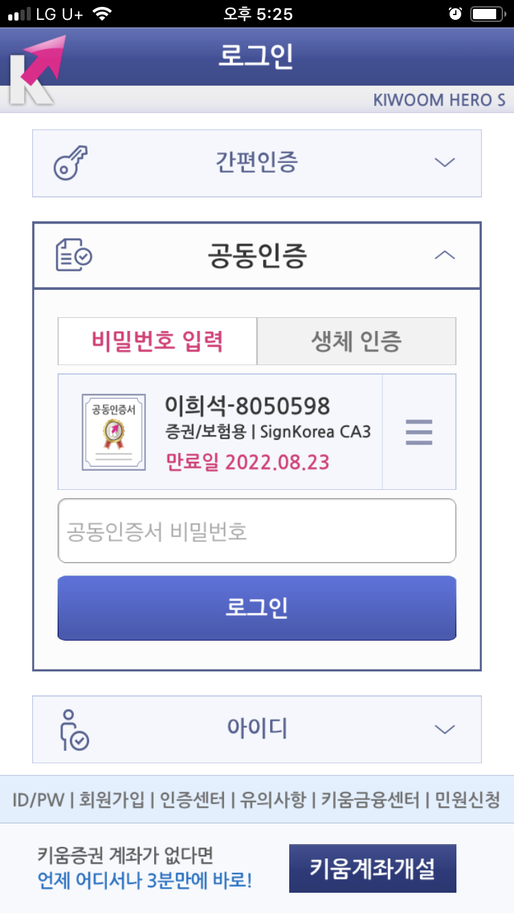 계좌번호를 입력해야하는데 계좌를 모른다면 계좌 개설하기에서 사용했던 키움증권 계좌개설 앱 하단에 보면 "계좌번호확인" 탭이 있습니다. 해당 메뉴에서 이름, 주민등록번호 통신사를 입력하면 인증을 거쳐 계좌번호를 확인할 수 있습니다. 회원가입도 키움증권 계좌개설 앱에서 진행해도 됩니다. 단 키움증권 계좌개설 앱에서 공인인증을 받아도 내보낼 수 있는 방법이 없기 때문에 공인인증을 받으려면 결국 PC 를 이용하거나 폰에서 영웅문 s 를 설치해야합니다. 저 같은 경우는 이제 PC 가 없어서 아이폰에서 영웅문 s를 설치하고 공인인증서를 폰에서 설치했습니다. 공인인증서를 설치하는 것은 일반 은행 공동인증서 설치하는 과정과 동일 합니다. 설치가 완료되면 인증관리 메뉴에서 인증서 보내기 스마트폰 --> PC 를 선택합니다.