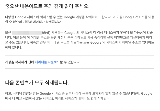 지금 까지 구글 계정 삭제(지메일 탈퇴) 방법을 알아봤습니다. 구글 계정을 삭제하기 전에 본인이 사용하던 계정의 데이터를 미리 백업받을 것을 권장하며 계정 삭제는 신중해야합니다. 간혹 구글 계정 자체엔 특별한 데이터가 없었다 해도 해당 계정으로 다른 계정에 로그인하도록 연동을 해두었을 수도 있기 때문에 자칫하면 낭패를 볼 수 있습니다. 주의하고 신중하게 결정해야하겠습니다.
