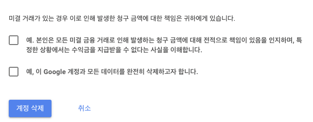 맨 아래쪽에 본인의 모든 미결 금융 거래로 인해 발생하는 청구금액과 관련해 전적으로 본인 책임이라는 점에 동의하는 체크박스와 데이터가 모두 삭제되는 것에 동의한다는 체크박스에 체크후 계정 삭제를 누르면 구글 계정이 삭제 됩니다.