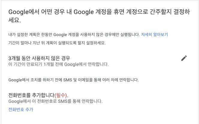 맨 아래 있는 계정 처리 계획 세우기를 먼저 이용해보면 휴면 계정 관리자 페이지를 만나게 됩니다. 여기에서 본인의 계정이 휴면 상태가 되면 데이터를 어떤 식으로 처리할 지를 구글이 관리할 수 있게 해주는 건데요. 일정기간 동안 사용하지 않는 경우를 설정할 수 있습니다.
