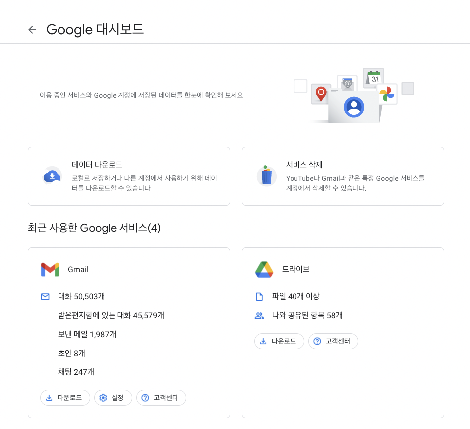 본인 계정의 대시보드에 접속하면 지메일, 드라이브, 구글 플레이, 캘린더 및 계정에 저장된 데이터가 얼마나 되는지 한번에 파악할 수 이고 다운로드도 할 수 있습니다.