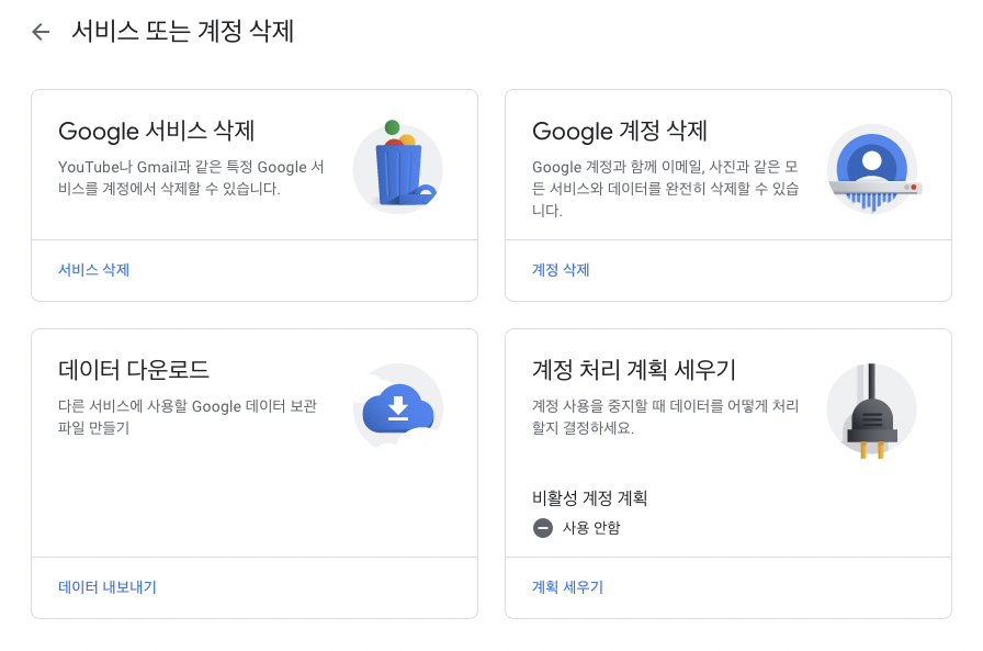 구글 서비스 또는 계정 삭제 페이지로 이동하면 구글 서비스를 삭제하거나 구글 계정 삭제, 데이터 다운로드 그리고 계정 처리 계획 세우기 메뉴를 확인할 수 있는데요.