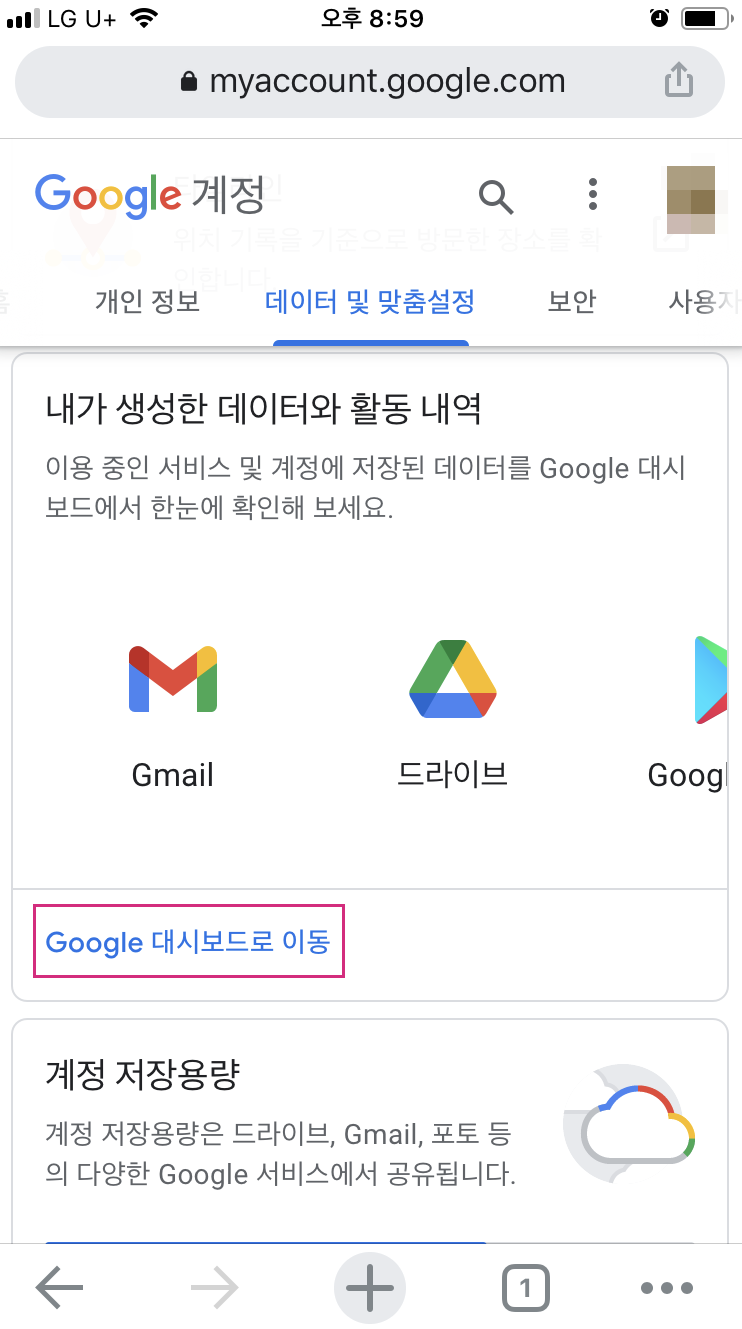 계정 이동 후 데이터 및 맞춤설정 탭(메뉴)를 선택하고 아래로 스크롤 하면 Google 대시보드로 이동 링크가 있습니다. 링크를 클릭하면 PC화면과 유사한 구글 대시보드 페이지가 나옵니다. 나머지는 PC 에서와 동일합니다.