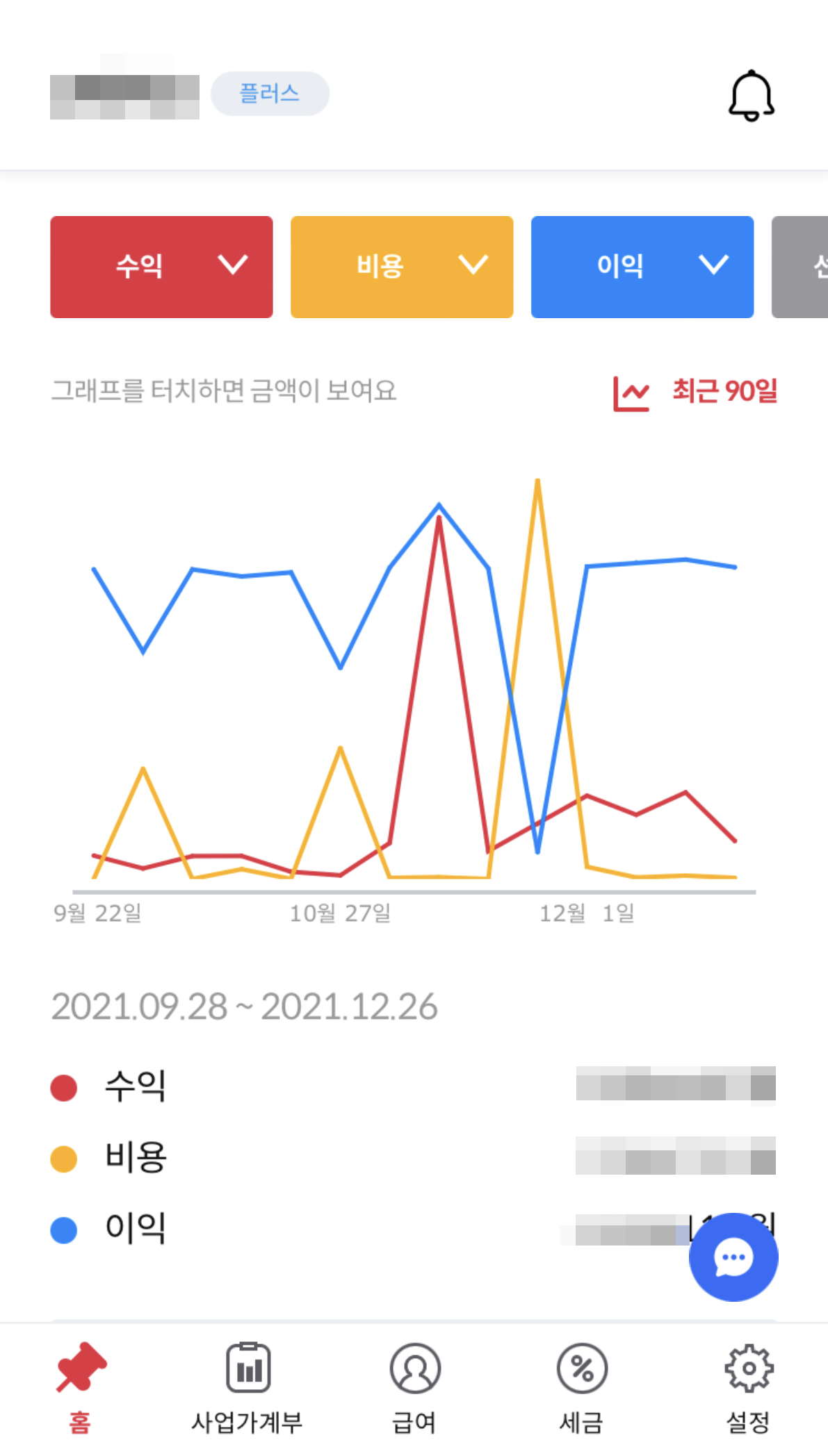 머니핀을 사용하면 수익, 비용, 이익을 한눈에 볼 수 있습니다. 입출금되는 통장, 카드 등을 등록하고 수익, 지출이 발생하는 통장을 등록하면 정보를 가져와서 뿌려주기 때문에 관리가 아주 쉽습니다.