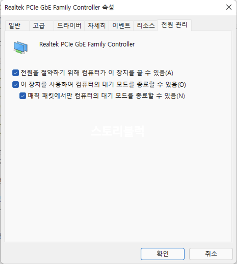 속성창에는 여러가지 탭이 보이는데요. 상단의 전원관리 탭을 클릭합니다. 전원을 절약하기 위해 컴퓨터가 이 장치를 끌 수 있음이 선택되어 있어야 나머지도 선택이 가능합니다. 이 장치를 사용하여 컴퓨터의 대기 모드를 종료할 수 있음, 매직 패킷에서만 컴퓨터의 대기 모드를 종료할 수 있음이 모두 선택되어 있어야 합니다.