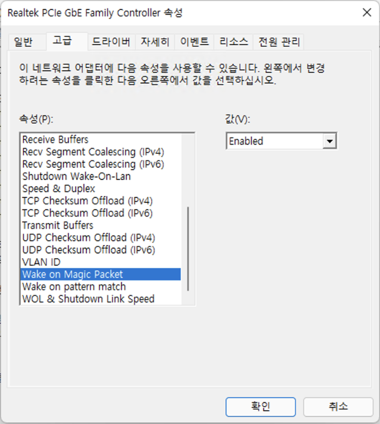 전원관리 항목들을 체크한 후 "고급" 탭을 선택합니다. 고급탭에서는 Wake on Magic Packet을 선택하고 값은 Enabled를 선택해서 활성상태가 되도록 해줍니다. 확인을 누르고 저장한 다음 부팅을 다시 해주면 설정이 끝납니다.