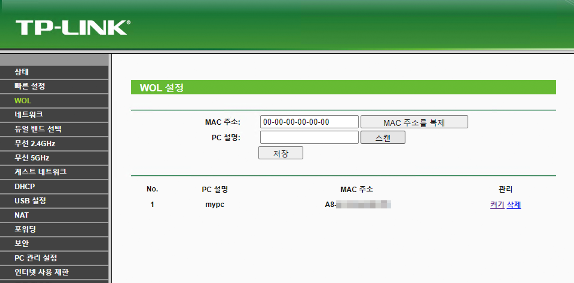 그럼 PC에서 WOL을 위해 설정할 바이오스에서 WOL 활성화, PC 설정에서 WOL을 위한 설정은 모두 마무리가 된 것이구요. 마지막으로 공유기에서도 WOL을 켜줘야 합니다. 저는 TP-LINK 제품을 사용하고 있는데 아래와 같이 WOL이 별도 메뉴로 나와 있습니다. IPTIME에도 동일한 설정이 있을 거예요. TP-LINK는 맥 주소를 넣으면 설정이 완료됩니다.