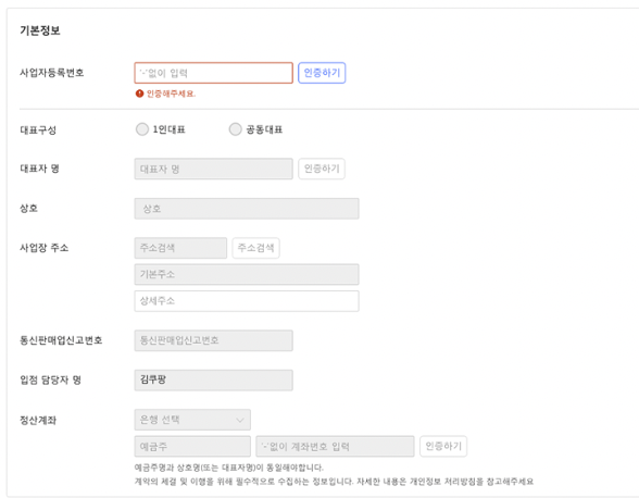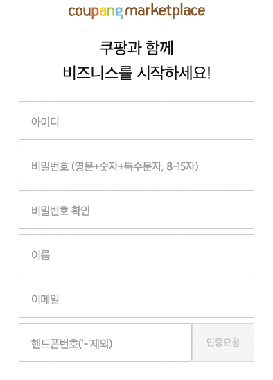 판매자로 가입하는 방법은 간단합니다. 입점신청은 간단히 아이디 패스워드, 이름, 이메일 휴대폰 번호로 가입하고 판매자 계정을 바로 생성할 수 있어요.