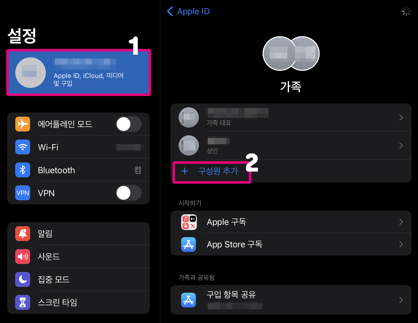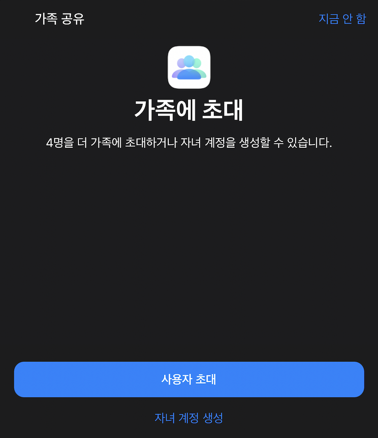 설정 > Apple ID, iCloud, 미디어 및 구입을 탭하면 Apple ID 화면에서 "+ 구성원 추가" 메뉴를 이용할 수 있습니다. 구성원 추가 메뉴를 누르면 가족에 초대라는 팝업이 뜨는데 아래쪽에 자녀 계정 생성이라는 메뉴가 있습니다.