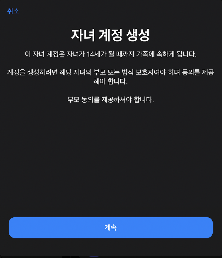 이렇게 가입이 제한된 경우엔 "자녀 아이디"를 생성해서 가입할 수 있습니다.