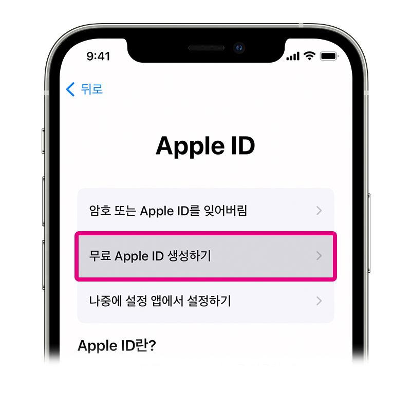 아이폰, 아이패드 등을 구매해서 처음 설정할 때는 애플 아이디가 없거나 잃어 버렸습니까를 탭하고 무료 애플 아이디 생성하기를 탭해서 아이디를 만들면 됩니다. 이 때 아이디를 만들지 않고 나중에 설정 메뉴에서 아이디를 만들어도 됩니다.