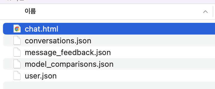 다운로드한 파일에는 Chat.html과 json 파일들이 담겨 있습니다. 열어보면 그동안 했던 작업들이 보입니다. 중간에 Request를 삭제하지 않았으면 모두 담겨 있으니 계정을 삭제하기 전에 꼭 Data를 Export하는 것이 좋겠습니다. 물론 모두 불필요하다면 할 필요 없겠구요.
