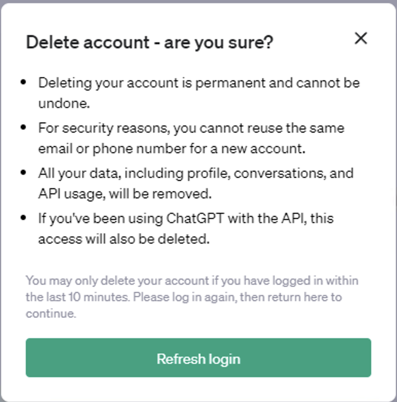 Refresh login을 누르면 계정 확인 절차와 함께 화면의 지시대로 따르면 open ai 계정 삭제 및 chatGPT탈퇴가 이뤄집니다.