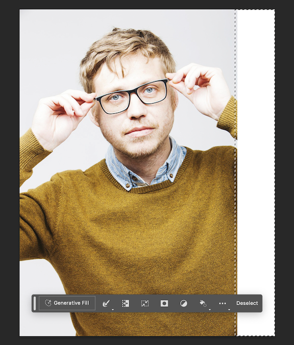 우측으로 여백을 늘린 이미지를 만들어보겠습니다. 캔버스 사이즈를 늘리고 우측에 여백이 생긴 곳에 generate를 작동시킵니다. 여백을 채우기 위해서 이전엔 도장툴(stamp)을 사용하거나 contents aware fill같은 기능을 썼지만 없는 구성요소는 -예를 들면 아래 인물의 팔 같은 - 만들기가 어려웠는데요.