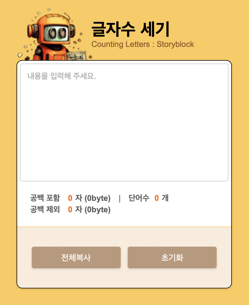 스토리블럭 초간단 글자수세기는 내용을 입력하면 즉시 글자수와 단어수를 알려주는 웹프로그램입니다. 블로그, 마케팅컨텐츠, 수험준비, 자기소개서, 이력서, 생기부, chatGPT