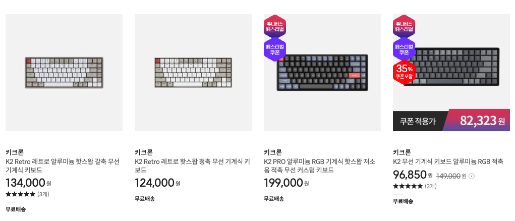 위에 쿠팡 최저가 K2는 언제까지 가능할 지는 모르겠지만 알루미늄에 핫스왑까지 가능하고 로켓배송인데 와우회원 할인까지 적용되면 제가 보기엔 최저가입니다. 다만 가끔 키크론에서 자체 홈페이지에서 할인을 하면 더 최저가가 될 수는 있지만 상시적으로 구매할 수 있는 가장 나은 솔루션은 쿠팡입니다. 위 제품은 심지어 레트로이기도 하니까요.