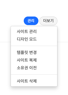 우츠의 더보기를 누르면 아래와 같이 메뉴가 나옥 디자인 모드에서 페이지를 추가하거나 수정, 위젯을 추가해서 페이지를 구현할 수 있습니다. 더 쉬운 방법은 이미 가입 당시 선택한 템플릿이 있다면 템플릿을 수정하면서 내용을 입력하거나 디자인을 수정하면 되겠구요.