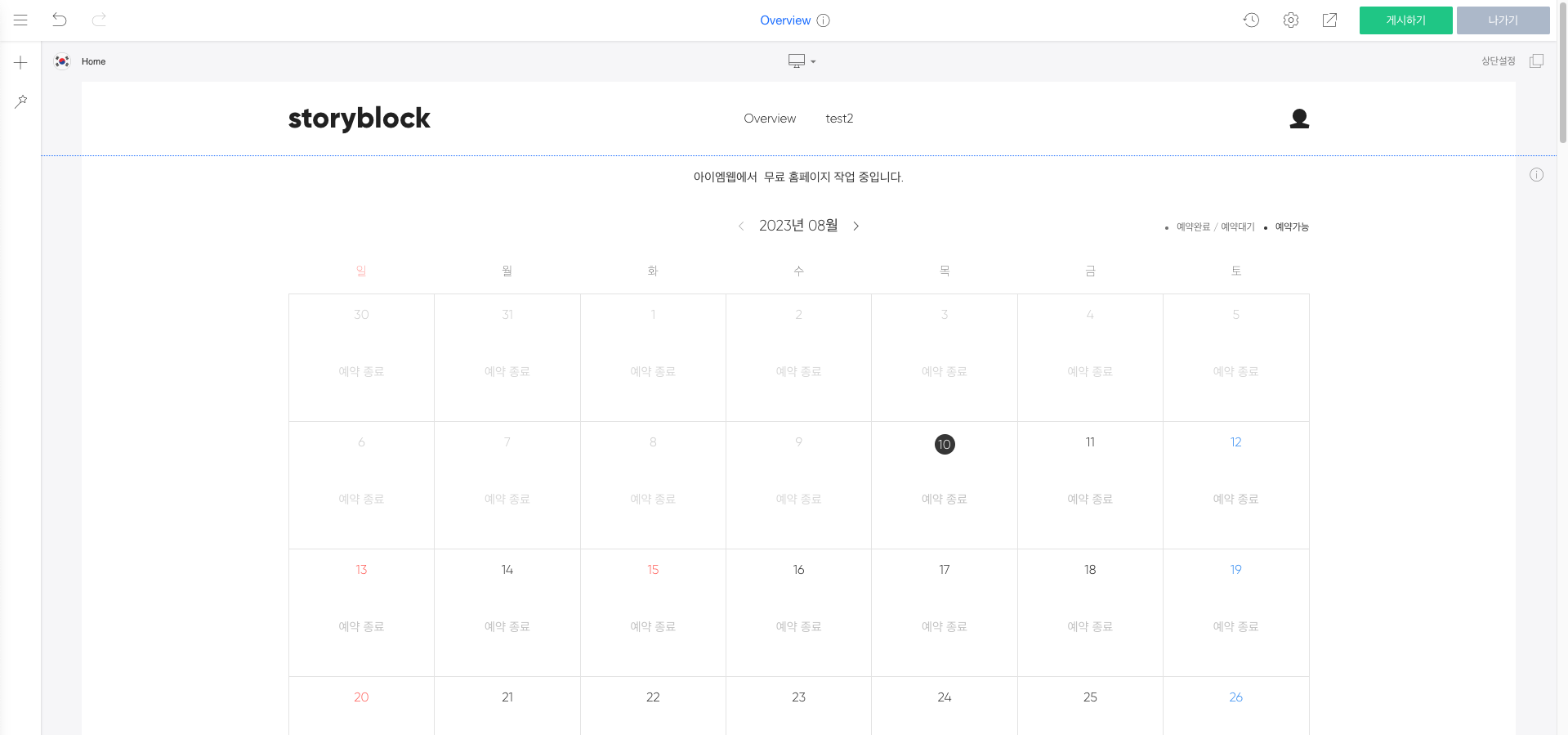 아임웹에서는 무료 버전으로 홈페이지를 만들 때에도 예약기능을 적용할 수 있어서 편리합니다.