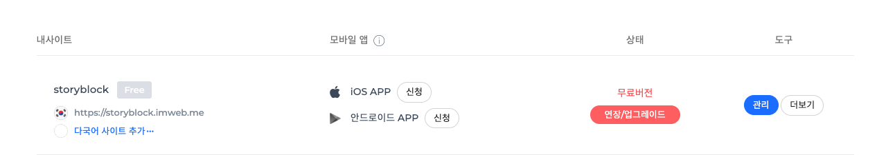 먼저 아임웹에서 홈페이지를 만드는 방법을 간단히 소개해드리겠습니다. 아임웹에서 회원가입을 하고 로그인을 하면 내 사이트 목록이 보입니다. 관리를 누르면 관리자 페이지에 접속할 수 있습니다.