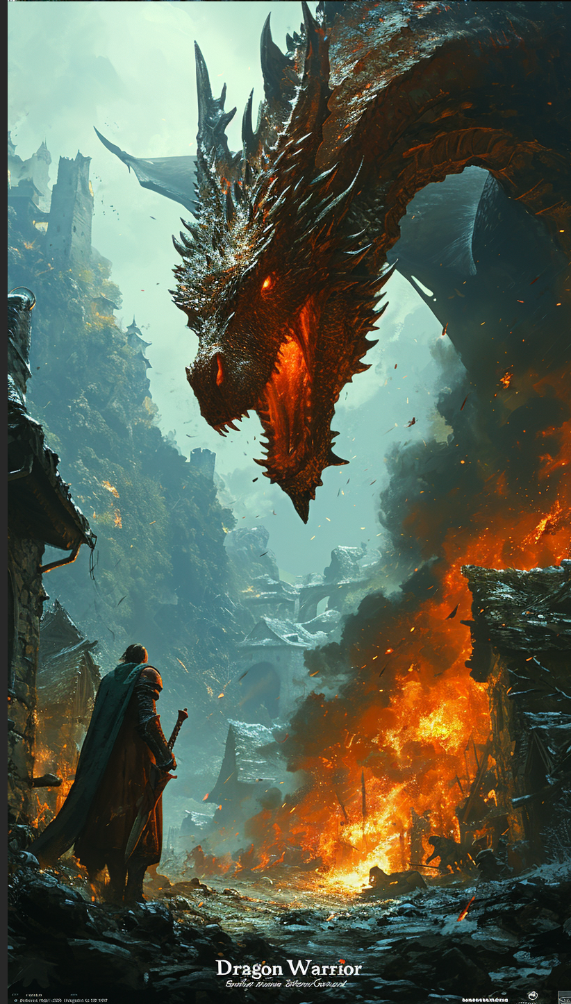 드래곤과 겨루는 모습의 포스터 이미지에 Dragon Warrior라고 넣어달라고 했더니 아래와 같은 이미지를 만들어주었습니다.