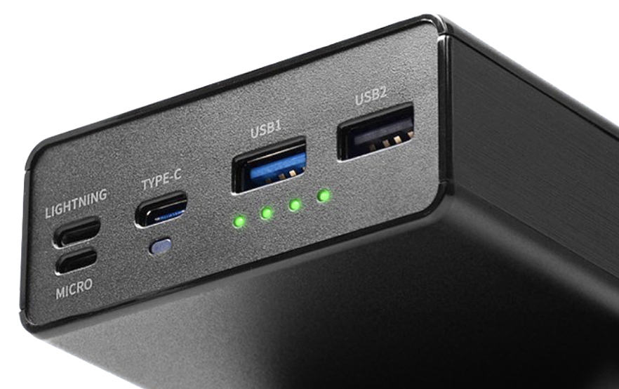 단자는 라이트닝 1, 마이크로 5핀 1, 타입 C 1, USB A 타입 2 로 되어 있습니다. 타입C 단자는 입출력 겸용입니다.