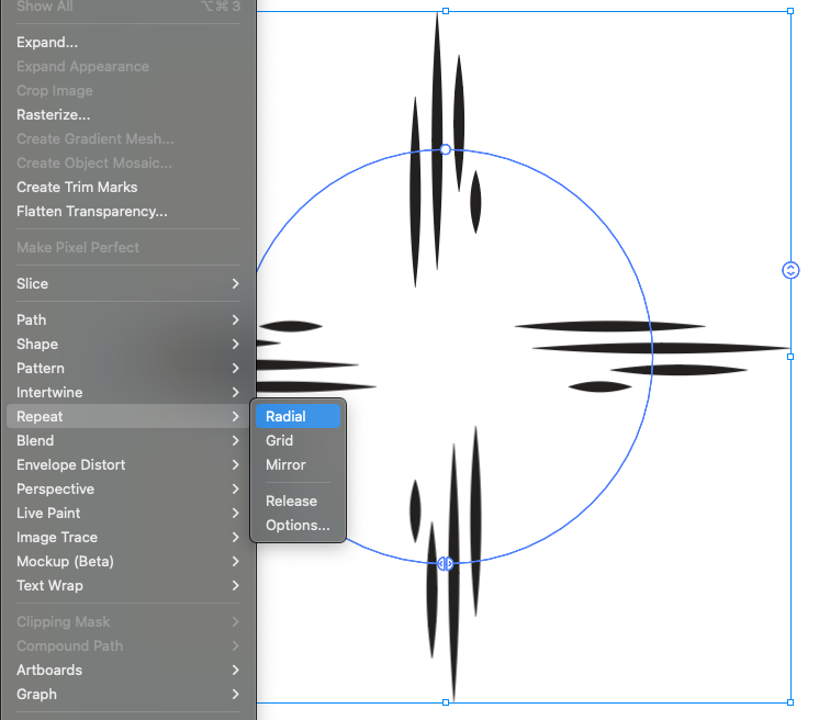 만들어 둔 오브젝트를 선택한 다음 오브젝트(Object) 메뉴에서 Repeat > Radial 을 적용합니다.